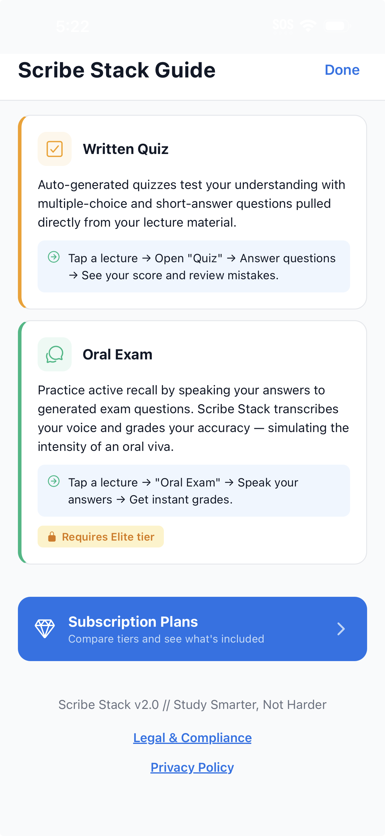 Where Scribe Stack truly separates itself: an adaptive written exam engine that generates fresh questions every session — no repeats, no false confidence — and a live AI oral examination that tests whether you can actually explain what you've learned. No other study app offers either.