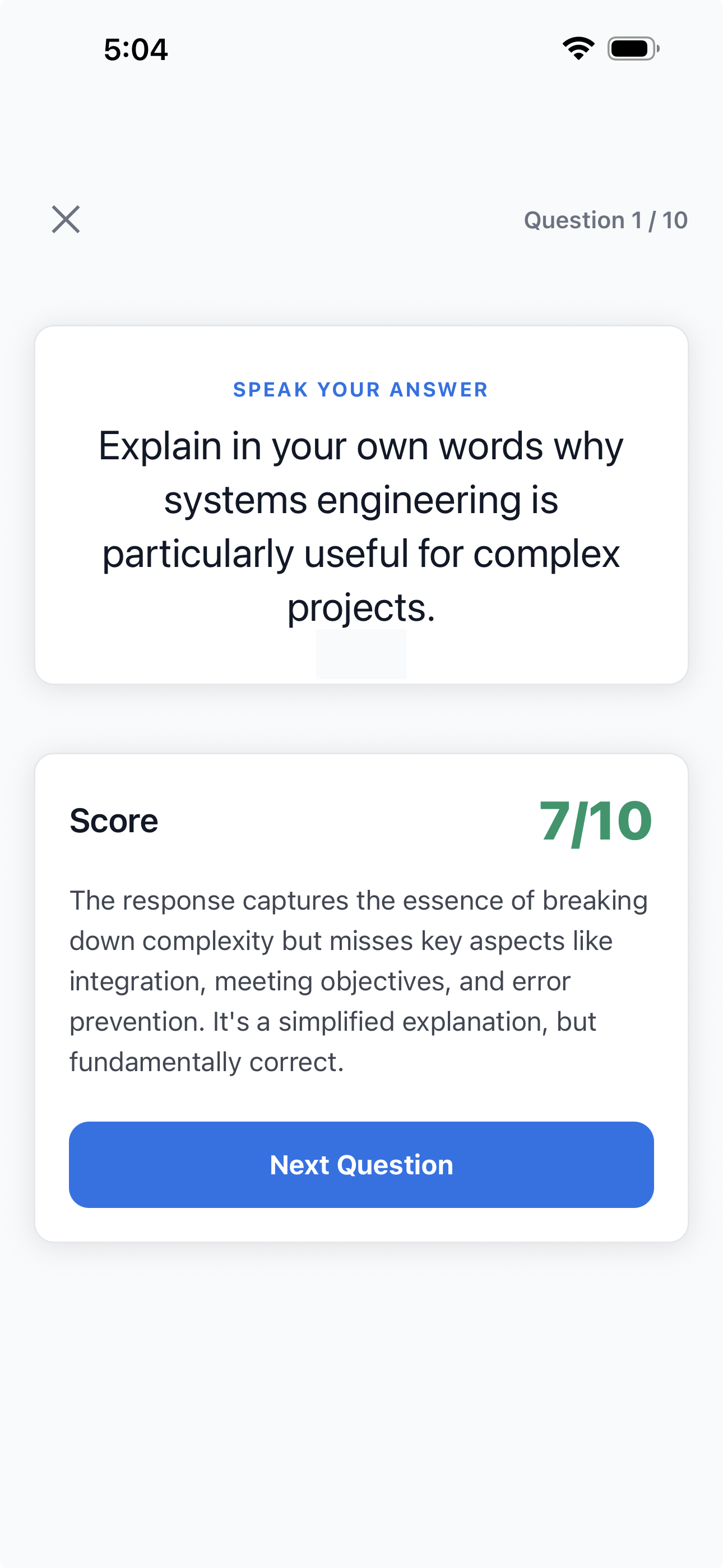 The AI oral examination reveals a question, you speak your explanation, and our AI grades your verbal response without multiple-choice crutches.